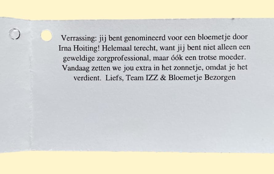 Wat een enorme verassing dat ik door IZZ uitgekozen ben voor bloemetje voor de zorg. Genietend van de bloemen en de intentie erachter, kijk ik vol vertrouwen uit naar de komende leerperiode.  Iedere leerling of nieuwe collega gun ik zo een veilige en goede leerplek als ik nu ervaar.